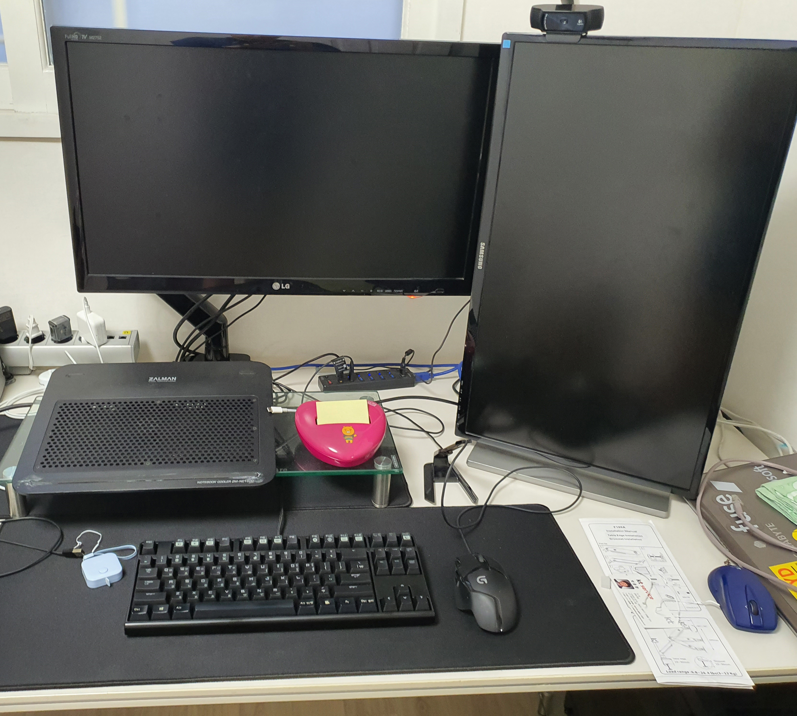 27인치 모니터 두개에서 책상이 넓은 편이라, 아직 체감은 되지 않는데, 공간 활용성이 높아진 것만은 분명!